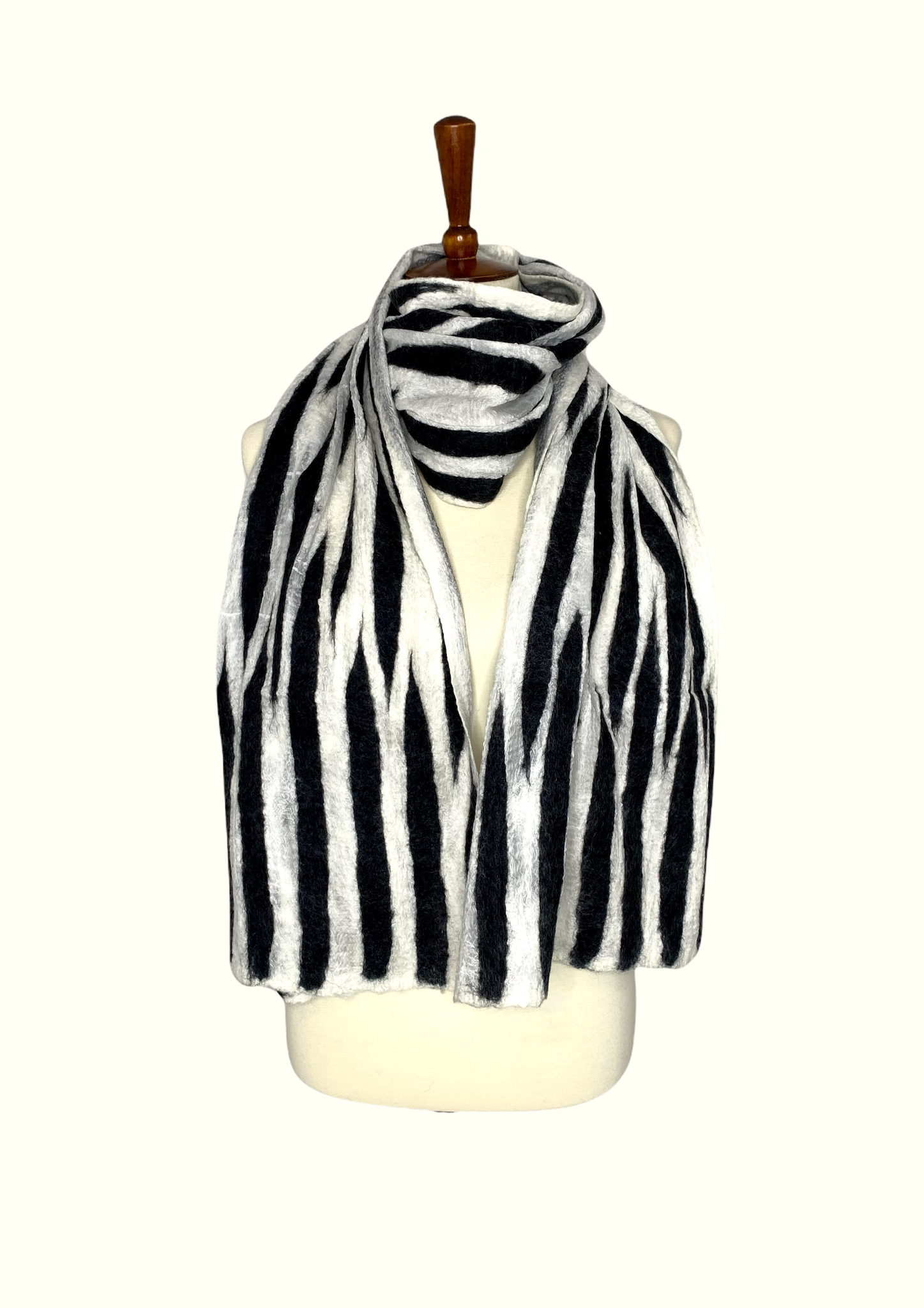 A dramatic felt scarf with sharp black lines running vertically and placed across a white background. All scarves are handmade, fair trade, and handled with care. Consists of merino wool on chiffon from Nepal.