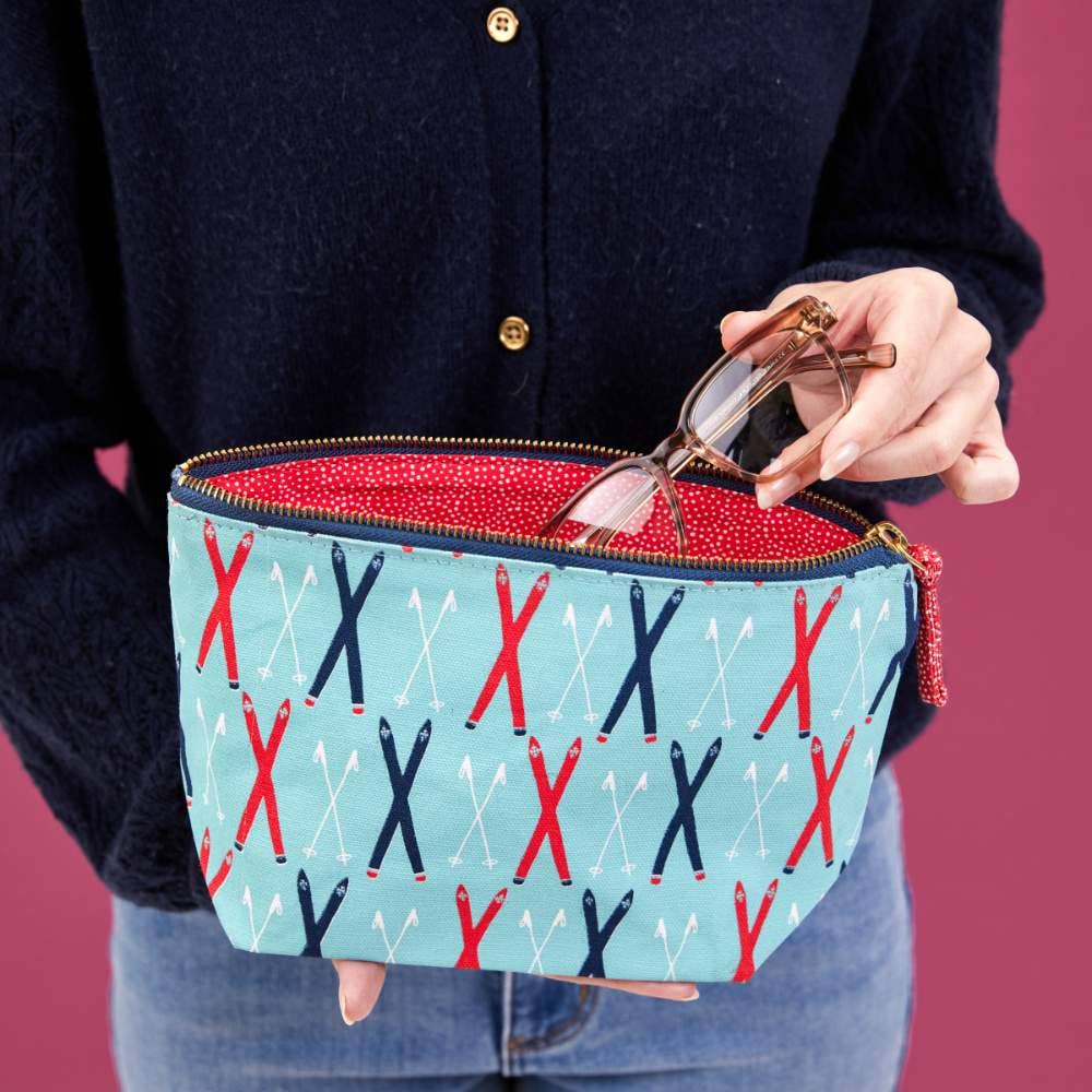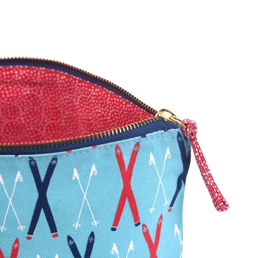 Pouches - the perfect organizer! Designed in a variety of exciting prints to mix and match. DETAILS • Medium: 10 in x 6 in x 3.5 in • 100% cotton canvas • printed looped zipper pulls and pouch lining • gold metal zipper closure • min 2