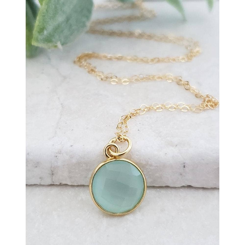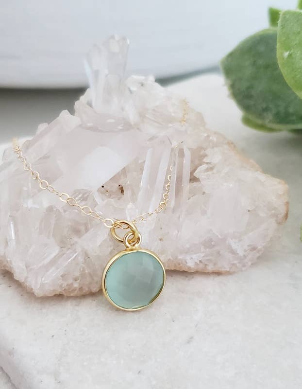 Stunning aqua chalcedony gemstone bezel set in round gold vermeil pendant hangs on a delicate 14k gold filled 18” cable chain with spring clasp. Each gemstone pendant will vary in size, color and texture.