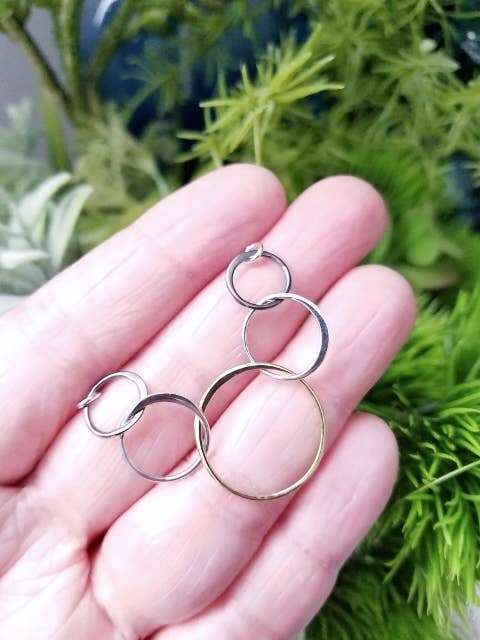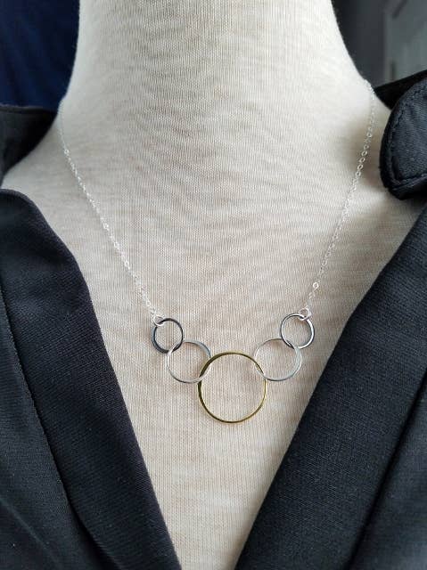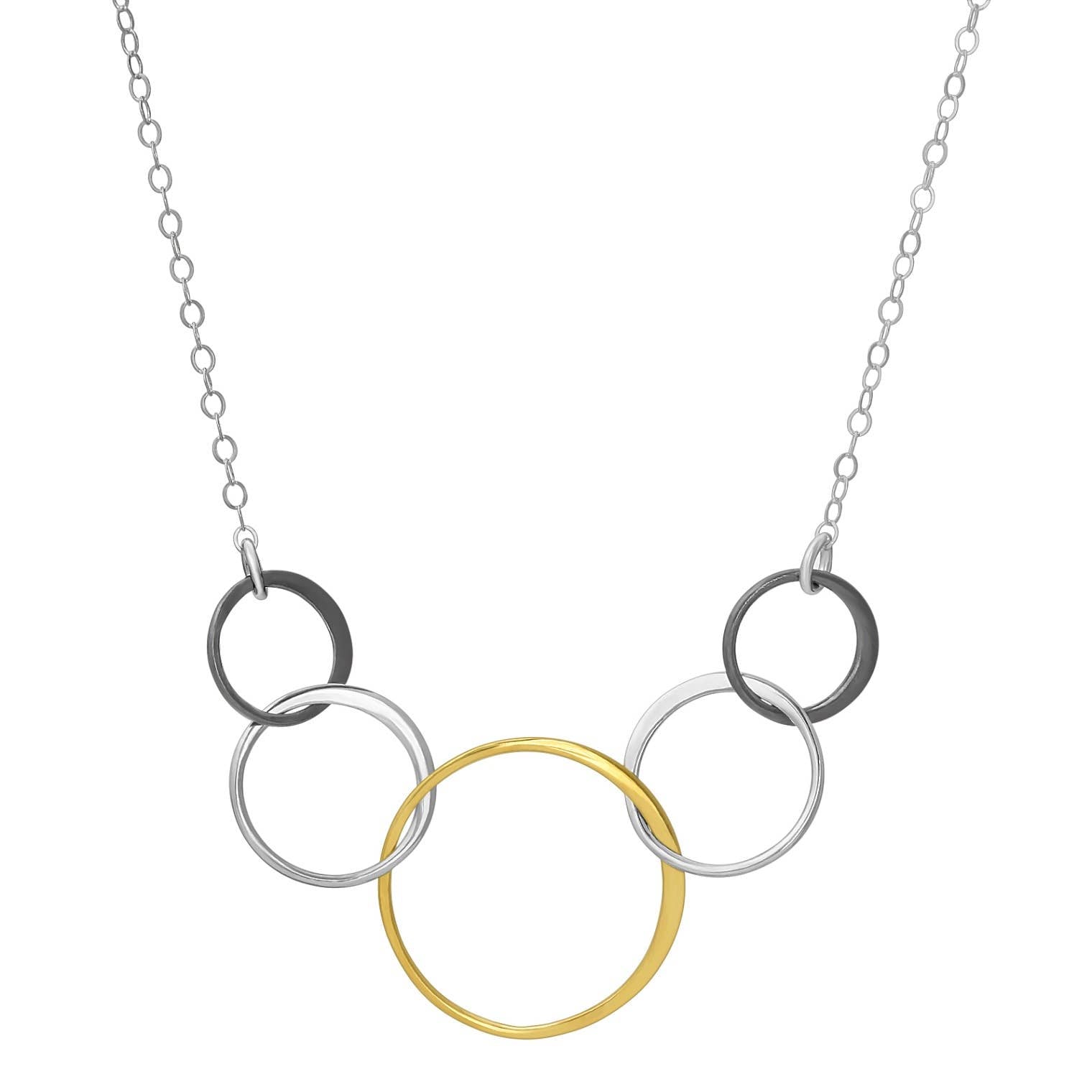 Elegant mixed metals. Each interlocking circle are in different finishses - Sterling silver, bronze and oxidize black over sterling silver. Sterling silver cable chain with spring clasp.