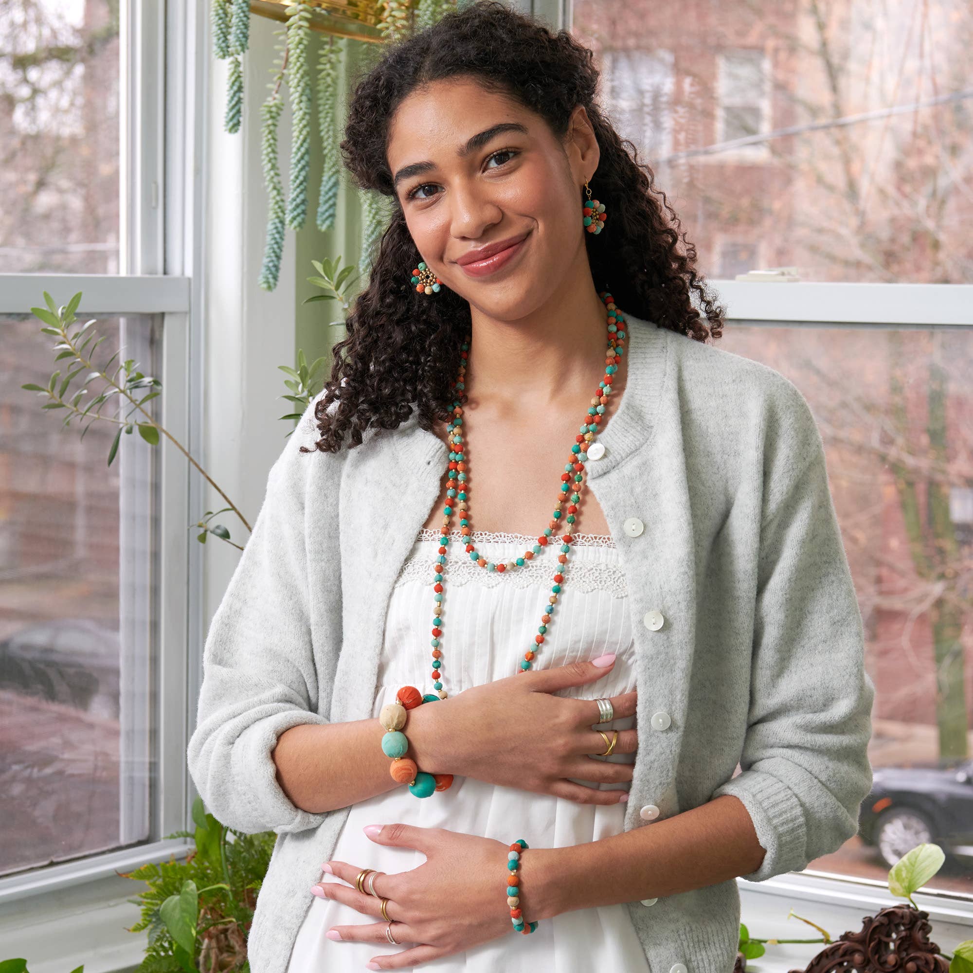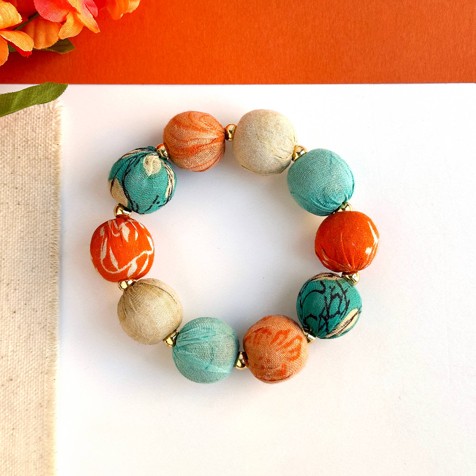Inspired by the sparkling blue waters and sunkissed landscape of this remote island in Italy, the Kantha Capri Collection includes best-selling styles in shades of turquoise, coral, and cream. The Kantha Capri Bold Bracelet features large beads interspersed with metallic gold beads for a bold, yet simple look. It is thoughtfully crafted from reclaimed Kantha & Sari textiles that have been hand-sorted, so each piece is slightly different. • Measures approx. 6" internal circumference. Beads measure 0.75" wide. Bracelet stretches to fit most. • Sustainably handmade by women artisans in India.
