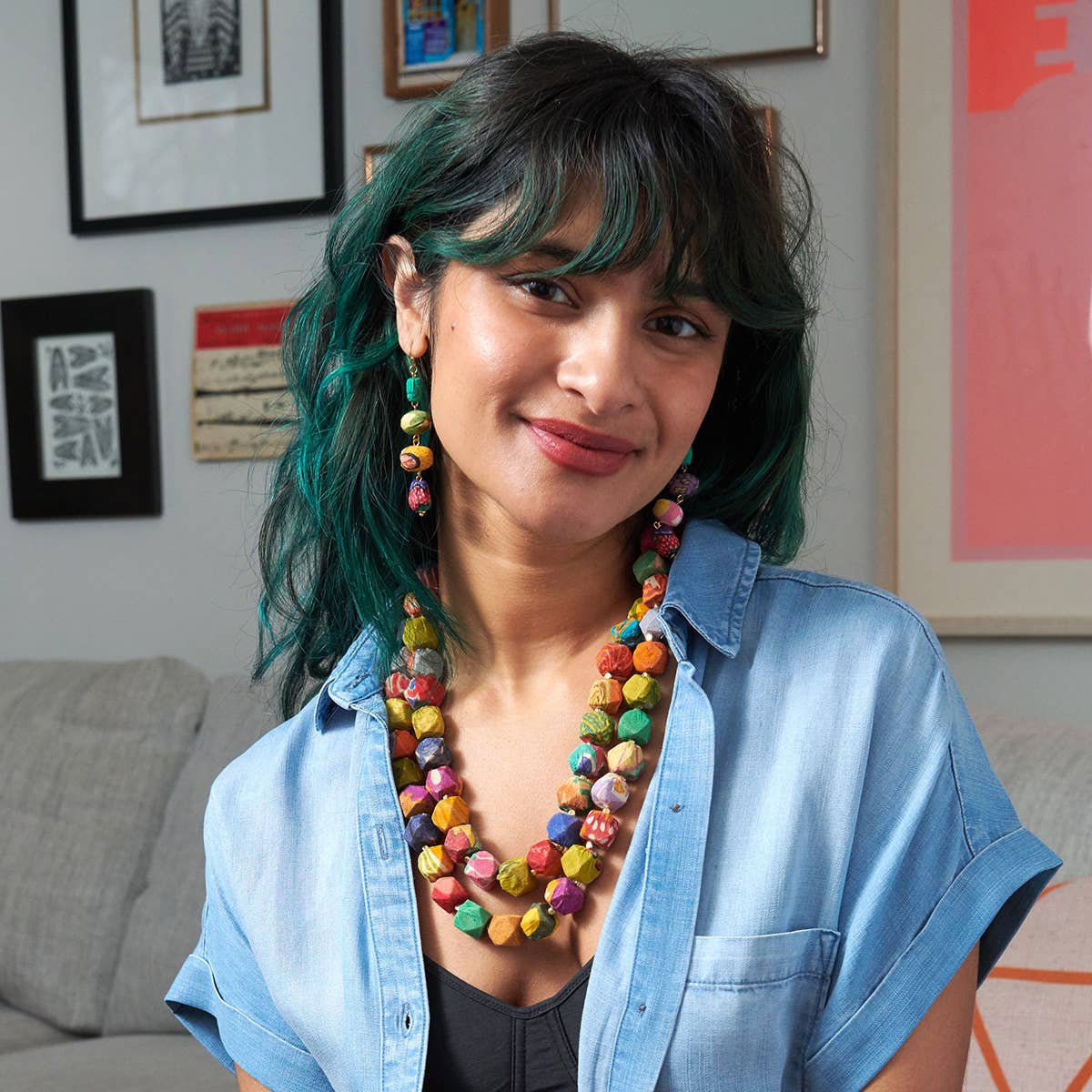 A linear arrangement of Kantha beads in oval, barrel and teardrop shapes dangle fluidly to form this unique style.